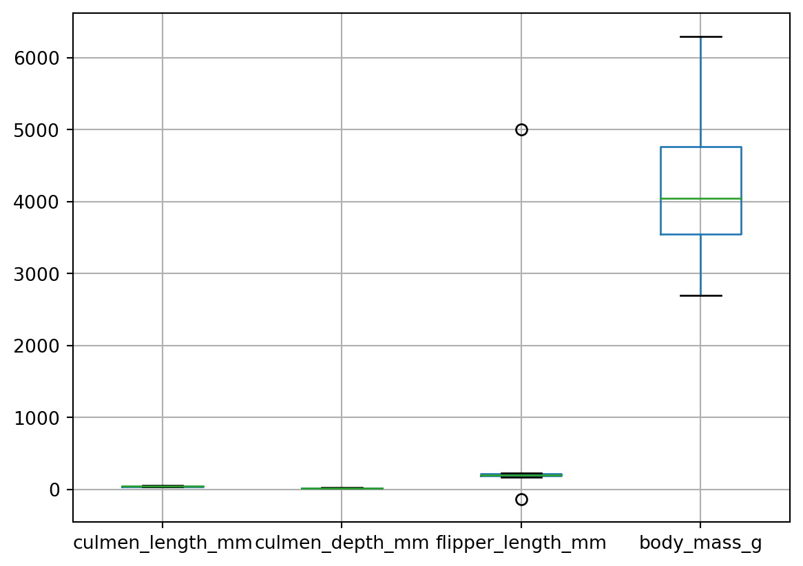 From the boxplot it is easy to detect that there are outliers (circles) in the column flipper_length_mm (flipper length). Thus, we need to remove these data so that they do not affect the performance of the model.