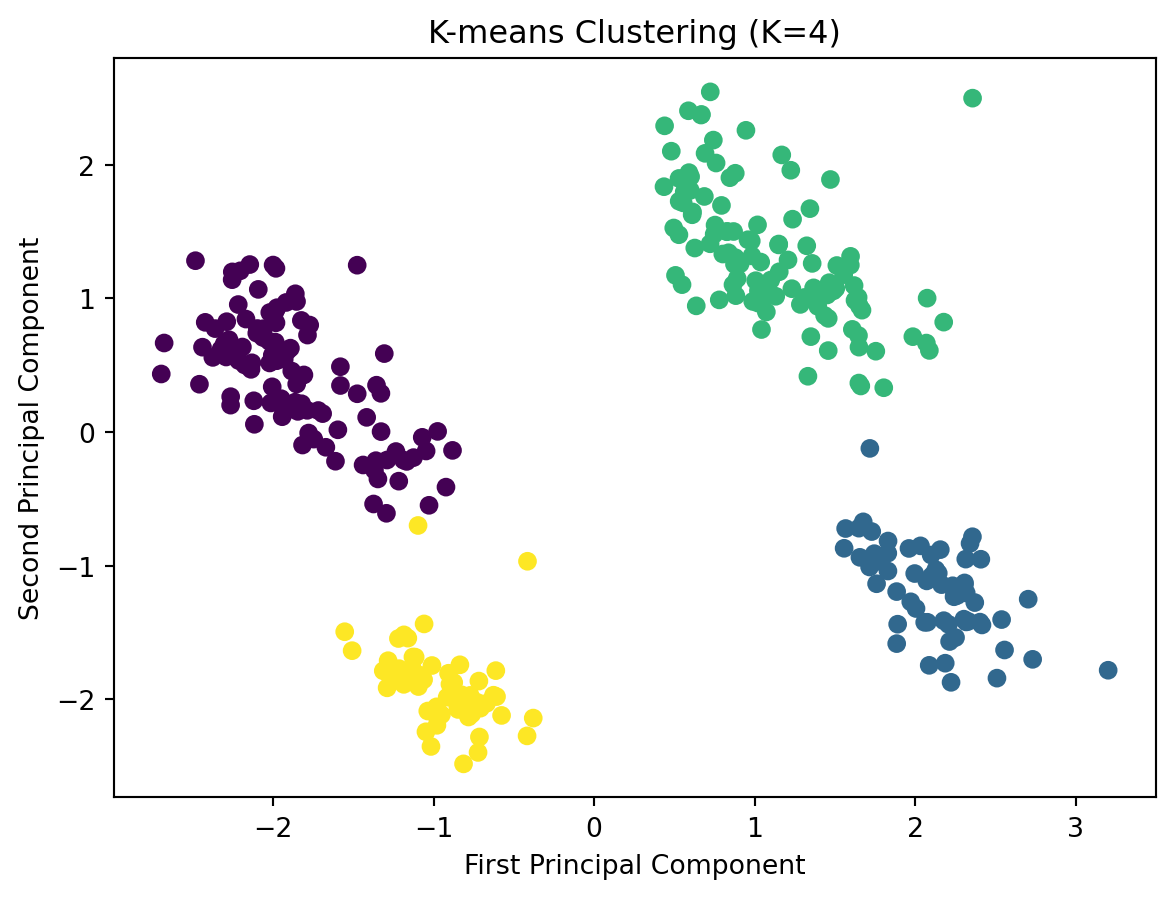In the clustering diagram, the four clusters are distinctly separated, each denoted by a unique color, indicating the K-means algorithm’s effectiveness in grouping data points according to their mutual similarities. The purple cluster in the bottom left and the yellow cluster in the top right appear more dense, suggesting a higher degree of similarity among their respective data points. In contrast, the green cluster on the middle right and the blue cluster on the middle left are more dispersed, hinting at greater variation within those clusters. There are no apparent outliers, as no data points are significantly distant from their cluster’s core, implying a relatively uniform data distribution. The demarcations between clusters, particularly between the purple and yellow ones, are quite pronounced. However, the boundary between the blue and green clusters is somewhat blurred, which may reflect a degree of overlap in the characteristics of these clusters’ data points.